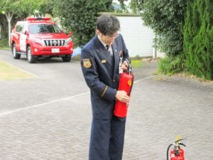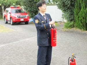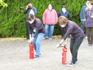 消防の方より消火器の使い方の説明を受けます