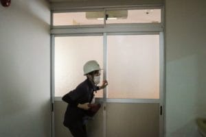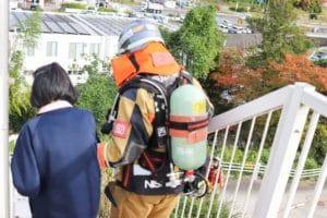メガホンサイレンを鳴らしながら避難誘導を行います。逃げ遅れ者がいないか、居室を回りカーテンの陰や押し入れの中も全て確認します