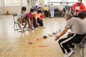 それぞれ点数が違う紙コップめがけてピンポン玉を投げ入れ、獲得点数を競います
