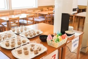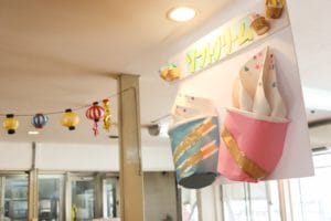 いつもの食堂がお祭りのような飾り付けでわくわくしますね