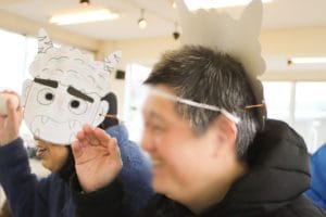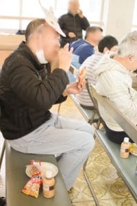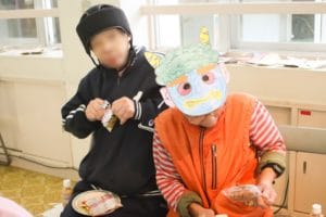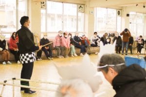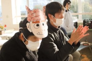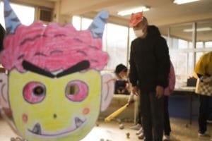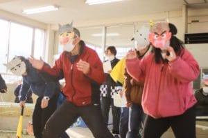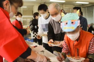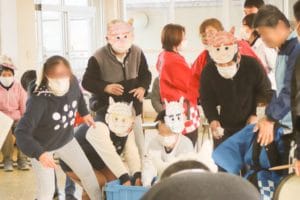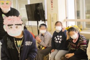 利用者のみなさんは自作の鬼のお面を、職員は法被を着て、ミニゲームと駄菓子屋さん&紙芝居を盛り上げました!