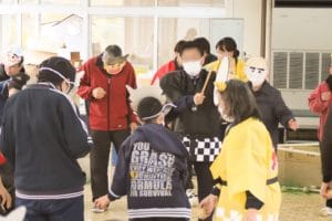 一方、守備チームは自作の鬼の面を着けゴール前で玉をはじいて入らないように守ります