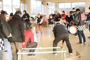 太鼓を打ち鳴らし、ゲーム終了の合図でゴールに入った玉の数を数えます